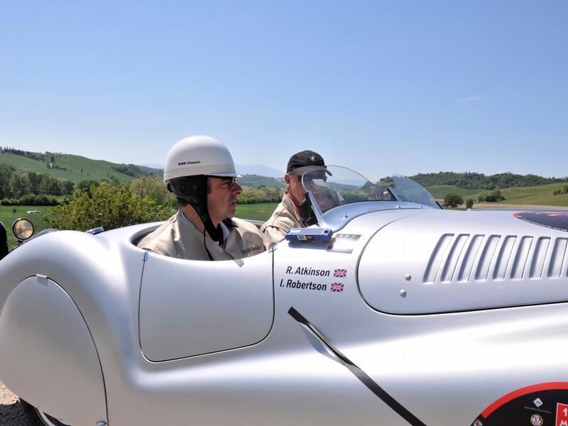 Rowan Atkinson (l) am Steuer eines Autos bei der Mille Miglia 2011 in Siena, Italien am 14. Mai 2011.