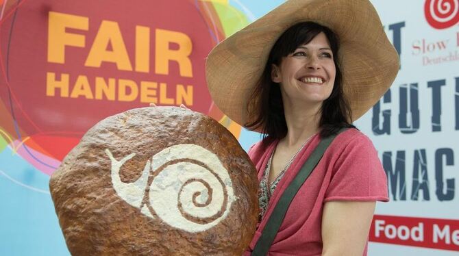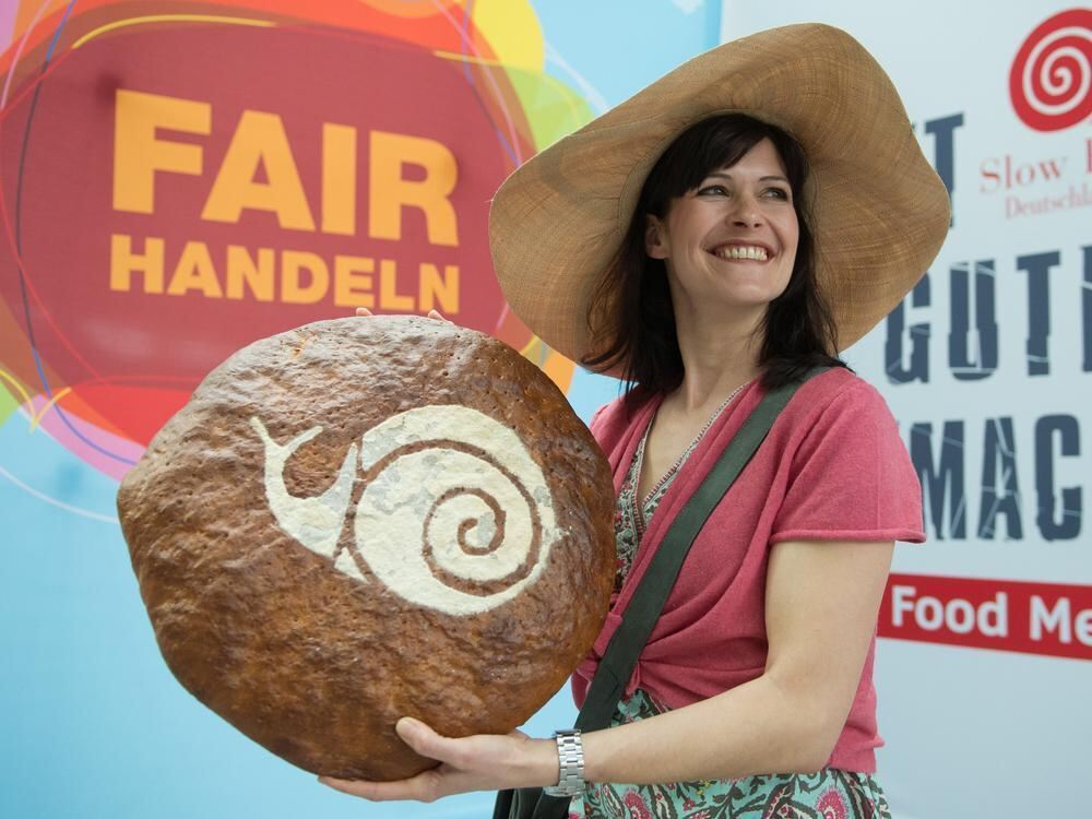 Modell Katrin hält während eines Fototermins ein Brot mit dem Logo der Organisation Slow Food in den Händen, im Hintergrund stehen die Signets der Messen Fair handeln und Markt des guten Geschmacks - die Slow Food Messe.