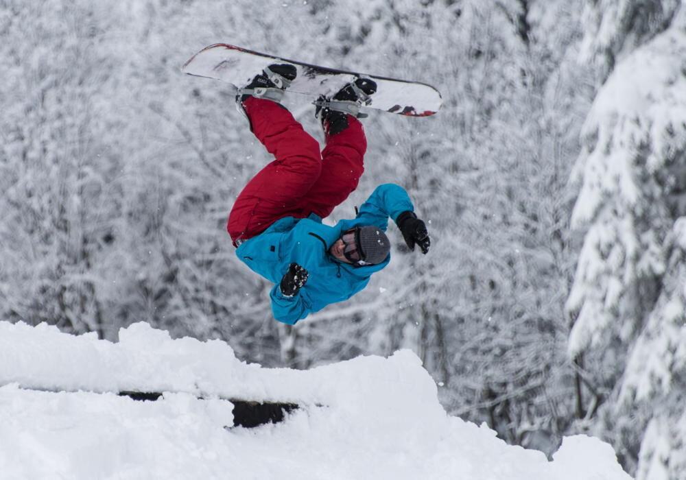 Ein Snowboardfahrer springt auf dem Feldberg im Schwarzwald durch die Luft.