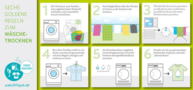 Um die Trocknungszeit zu reduzieren, sollte die Wäsche nach dem Schleudern in der Waschmaschine möglichst wenig Restfeuchte aufweisen. So kann nicht nur Strom für den Trockner eingespart werden, sondern auch Energie zum Beheizen des Trockenraums. Beim Trocknen auf Wäscheständer oder Leine in Innenräumen muss feuchte Luft durch mehrmaliges Stoßlüften nach außen abgeführt werden, damit es keine Schimmelflecken gibt.