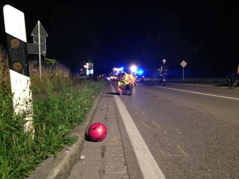Ein Fußball liegt auf der B12 bei Hergatz (Bayern) im Rinnstein, während die Polizei den Unfall aufnimmt. Foto: Richard Rädler/dpa