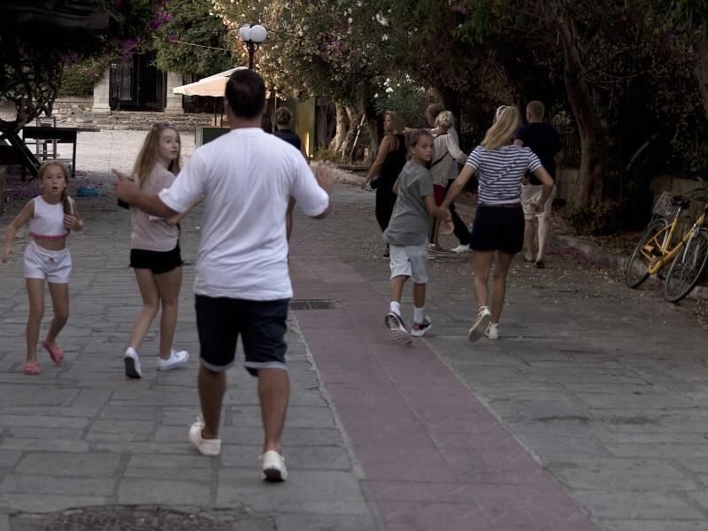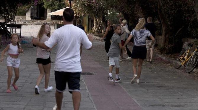 Touristen rennen bei einem Nachbeben am auf der Insel Kos. Foto: Petros Giannakouris