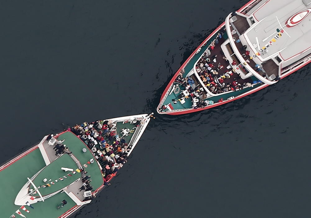 Zwei Passagierschiffe nähern sich auf dem Bodensee vor Konstanz so sehr, dass sich die Kapitäne der jeweiligen Schiffe vom Bug aus die Hand reichen können. (Archivbild)