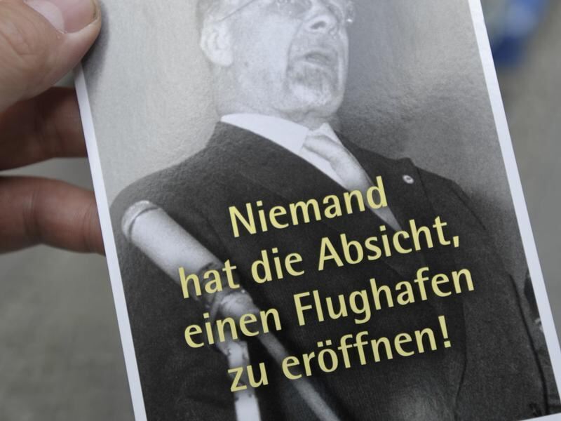 Postkarte mit der Aufschrift »Niemand hat die Absicht, einen Flughafen zu eröffnen«. Foto: Markus Heine