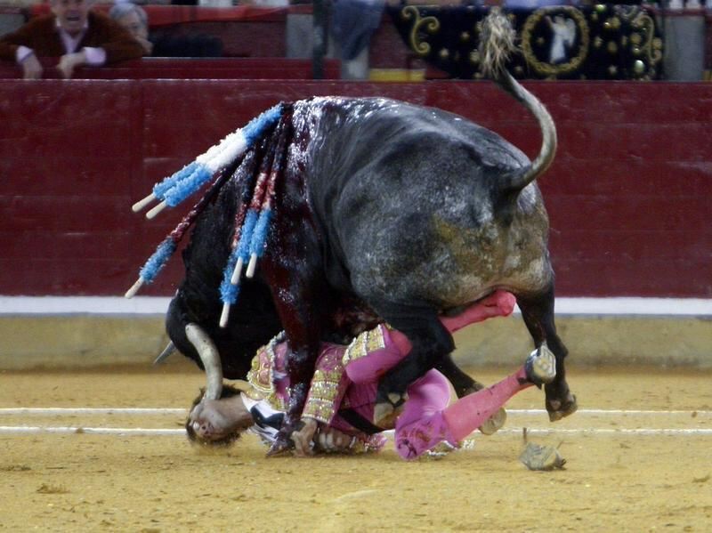 Der Stierkämpfer Juan José Padilla wird von dem Horn des Stiers im Gesicht durchbohrt. Foto: Javier Cebollada