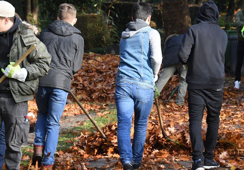 Jugendliche, die im Rahmen von Straftaten oder auch wiederholtem Schulschwänzen Arbeitsstunden auferlegt bekommen haben, beseitigen auf dem Hauptfriedhof Pforzheim Wege und Gräber von Laub. FOTO: dpa