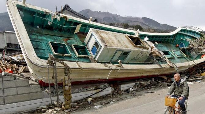 Nach dem Tsunami: Ein Fahrradfahrer passiert in Ofunato ein vom Tsunami in ein Haus geschleudertes Schiff.