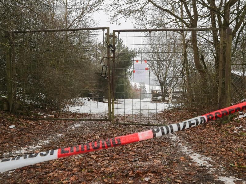 Absperrband der Polizei vor der Zufahrt zu dem privaten Grundstück in der Nähe von Arnstein bei Würzburg. Foto: Daniel Karmann