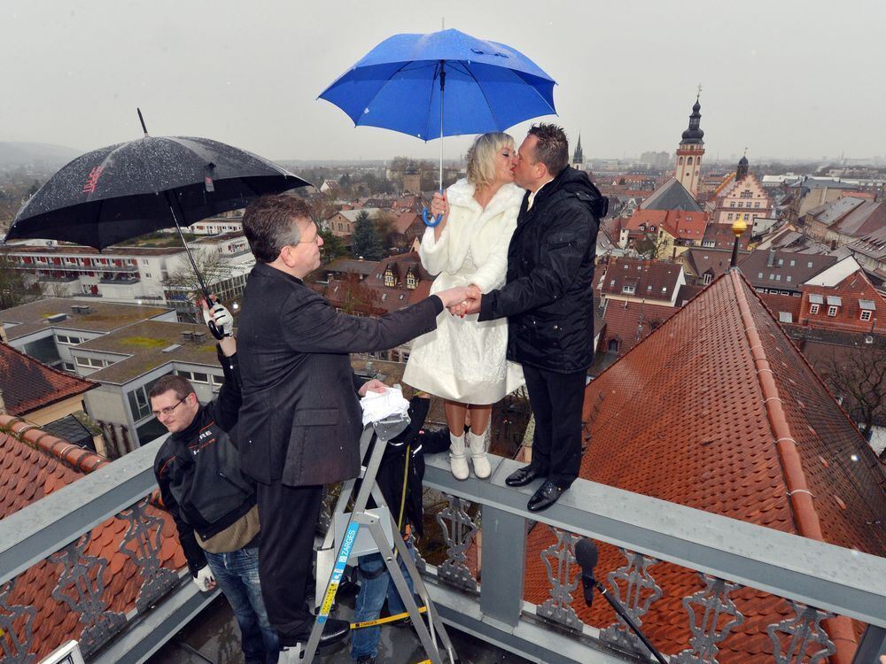 Uwe Schmidt (links), Pastor der Baptistengemeinde Kelsterbach, traut den Stunt-Performer Marko König und seine Ehefrau Yvonne kirchlich auf einer Brüstung der Karlsburg in Karlsruhe. Foto: dpa