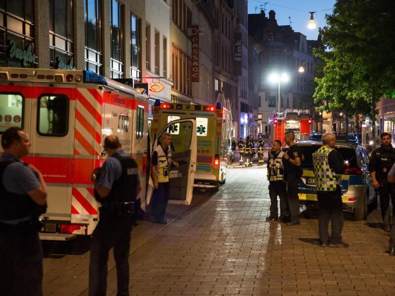 Polizisten, Feuerwehrleute und Sanitäter bei dem Einsatz in der Fußgängerzone der Wiesbadener Innenstadt. Foto: Michael Ehresmann/Wiesbaden112.de