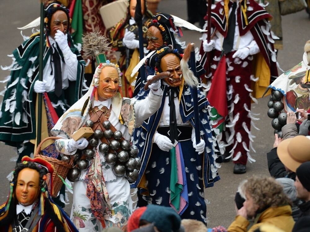 Die Rottweiler Narrenfiguren Schantle, Federahannes, Gschell und Biß laufen in Rottweil beim Narrensprung durch die Innenstadt.