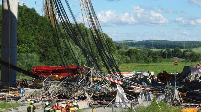 Ein eingestürztes Gerüst liegt unter der Autobahnbrücke bei Werneck. Foto: Nicolas Armer