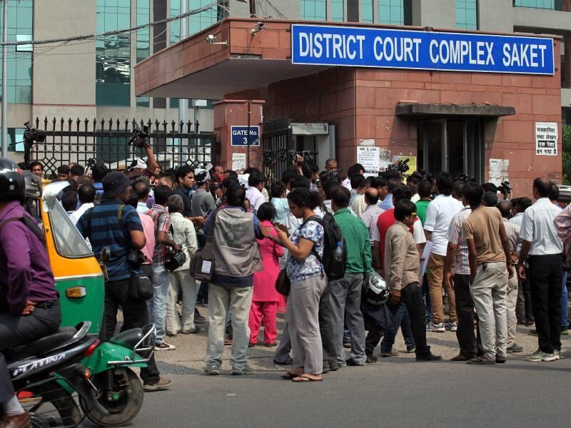 Medienvertreter und Demonstranten stehen vor dem Gerichtskomplex, in dem das Urteil gegen die Vergewaltiger gesprochen wird. Foto: Money Sharma
