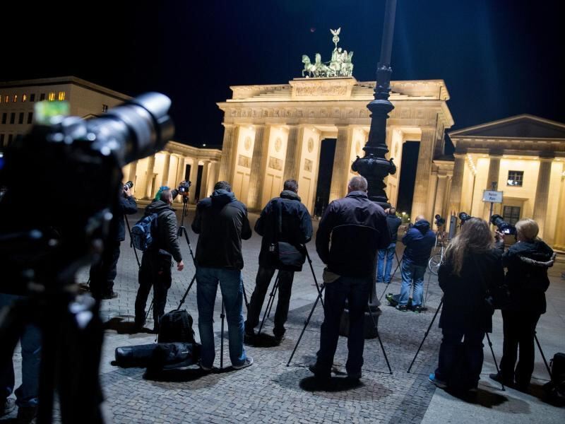 Frühaufsteher fotografieren am Brandenburger Tor in Berlin die Mondfinsternis. Foto: Kay Nietfeld