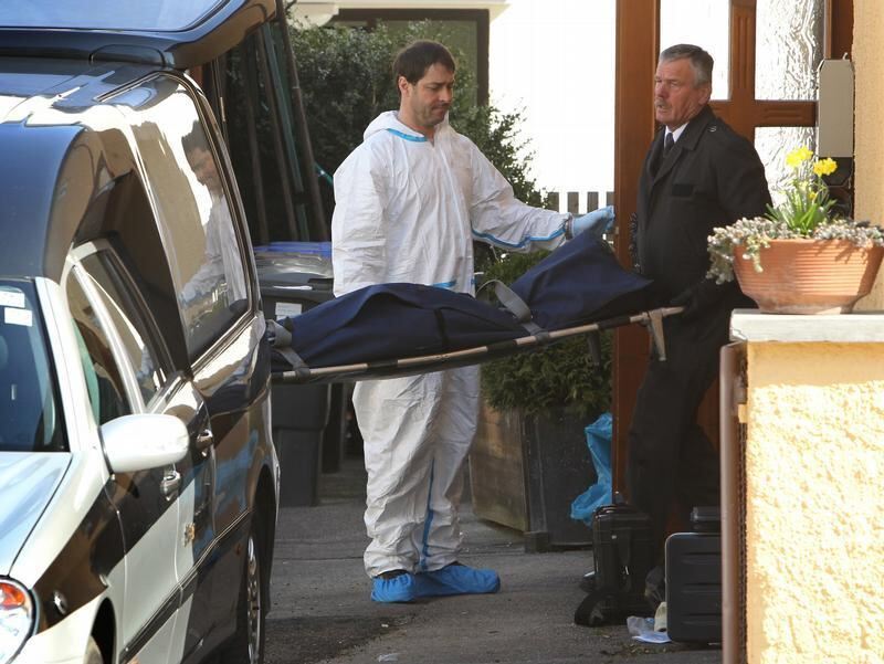 Mitarbeiter eines Bestattungsunternehmens tragen in Krailling ein totes Kind aus dem Haus.