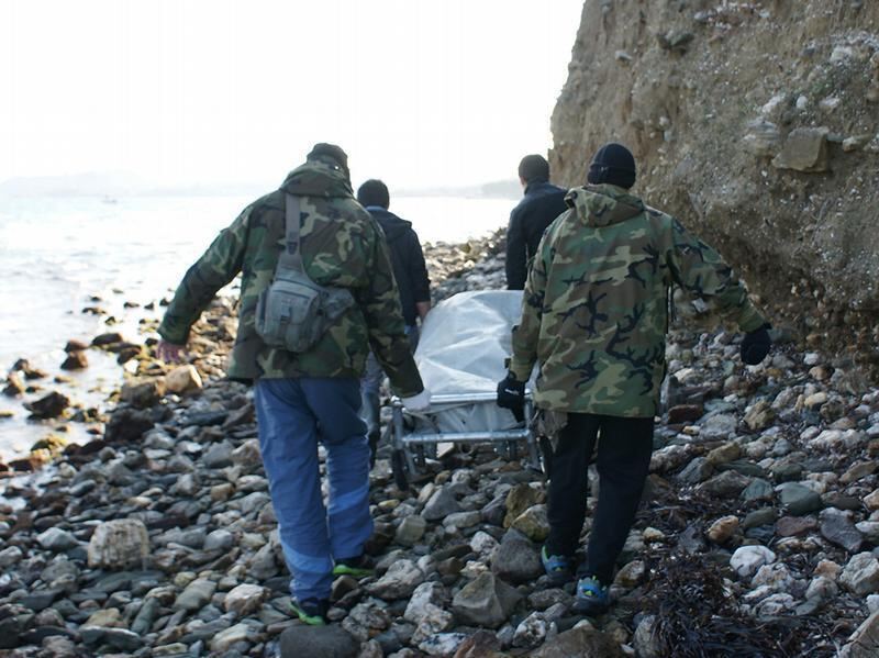 Retter tragen den Körper eines unbekannten Flüchtlings, der bei dem Unglück vor der griechischen Küste getötet wurde. Foto: STR