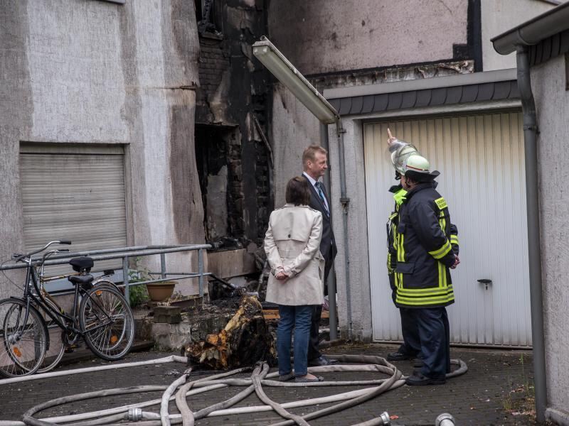 Der nordrhein-westfälische Innenminister Ralf Jäger lässt sich von Feuerwehrmännern den verlauf des verheerenden Brandes erklären. Foto: Maja Hitij