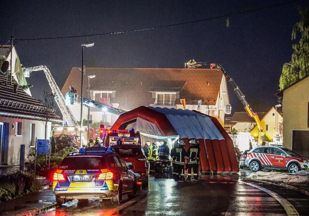 Feuerwehrkräfte sichern in Bad Waldsee Häuser, die nach einem Unwetter beschädigt sind. Eine Windhose hat in Bad Waldsee bei Ravensburg rund 50 Häuser zum Teil beschädigt.
