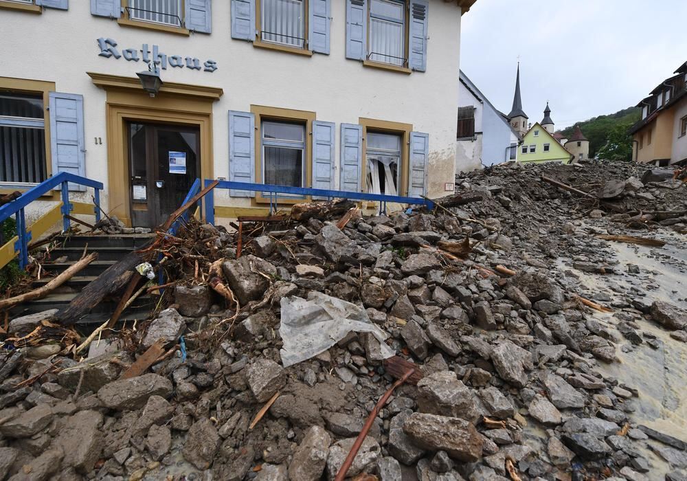 Geröll und Schutt liegt in Braunsbach vor dem Rathaus.