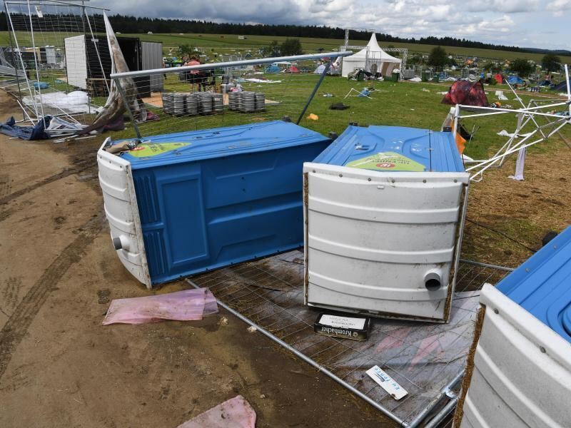 Umgestürzte mobile Toiletten: Das Southside-Festival musste wegen der Unwetter abgebrochen werden. Foto: Felix Kästle