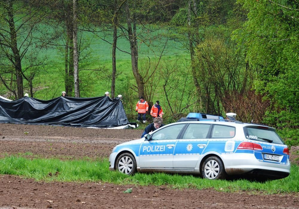 Rettungskräfte und ein Streifenwagen stehen in Kandern am Fundort des toten Jungen.