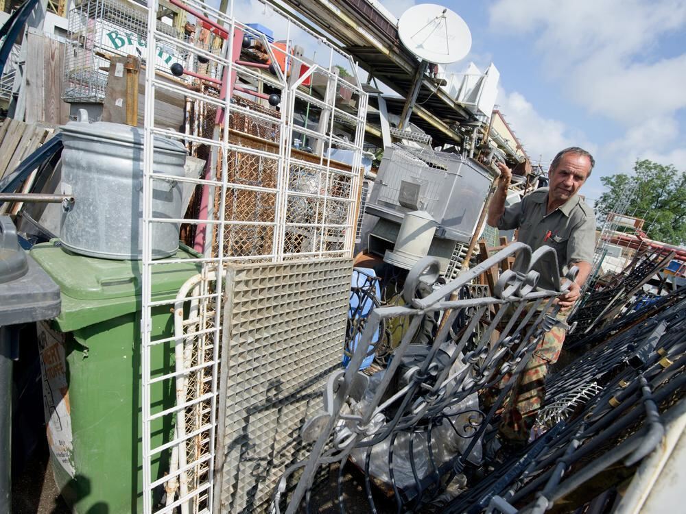 Der Trödelhändler Walter Krylyk steht in Aulendorf auf dem Gelände seines »Warehouse« und sortiert Fenstergitter.