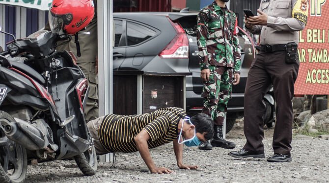 Aber im weltgrößten Inselstaat werden auch noch andere Varianten von »Public Shaming« angewandt, um die Corona-Regeln durchzusetzen: Das öffentliche Singen der Nationalhymne etwa, die erzwungene Teilnahme an Beerdigungen von Covid-19-Opfern (so geschehen in Tuban auf Java) sowie das Reinigen öffentlicher Räume in einer leuchtend-orangen Weste mit der Aufschrift »Verletzer des Gesundheitsprotokolls«.
