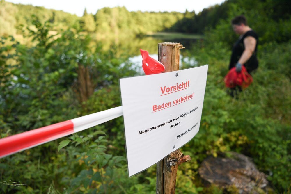 Schlangenkennerin Elke Karantanis sucht am 06.07.2017 bei Baindt (Baden-Württemberg) an einem Weiher nach einer Würgeschlange. Das Rätsel um eine angeblich bei Ravensburg gesichtete Würgeschlange ist noch nicht gelöst. Das Landratsamt hatte Warnungen am Seeufer anbringen lassen.
