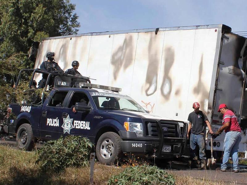 Ermittler durchsuchen bei Michoacan einen ausgebrannten Lastwagen. In dem Wrack wurden fünf Leichen entdeckt. Foto: epa/str