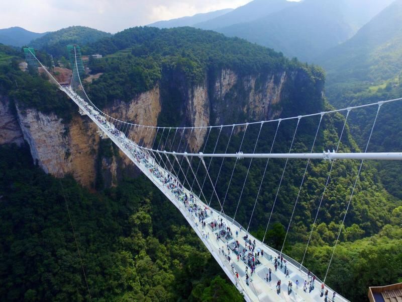 Nichts für Ängstliche: Die längste und höchste Glasbrücke der Welt überspannt ein tiefes Tal in der chinesischen Provinz Hunan. 300 Meter sind es bis zum Talboden. Foto: Shao Ying