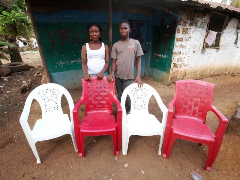 Lorpu Kollie (l) und ihr Bruder Anthony (r) leben im liberianischen Monrovia. Die leeren Stühle symbolisieren Verwandte, die sie durch Ebola verloren haben. Foto: Ahmed Jallanzo