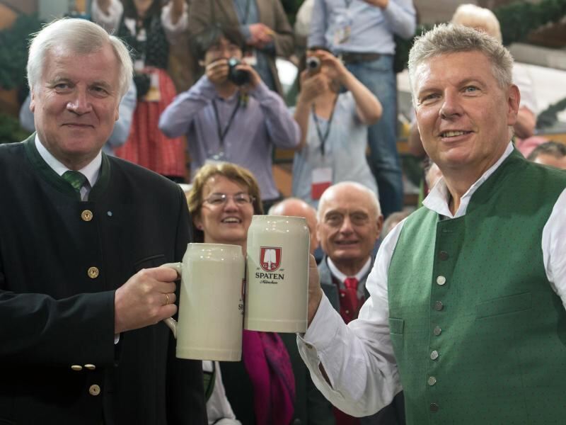 Der bayerische Ministerpräsident Horst Seehofer (l) und Münchens Oberbürgermeister Dieter Reiter stoßen an. Foto: Peter Kneffel
