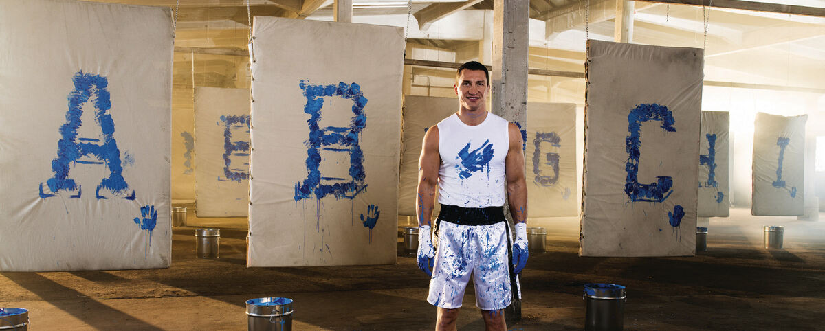 Wladimir Klitschko boxte »in seinem ersten Kampf über 26 Runden« jeden Buchstaben des Alphabets in blauer Farbe auf Leinwand und signierte die Unikate anschließend. Die Aktion sollte die Aufmerksamkeit auf die weltweite Bildungsarmut unter Kindern lenken. Die Leinwände wurden versteigert und der Erlös kam der eigenen Stiftung wie auch der Aktion »Ein Herz für Kinder« zugute. FOTOS: KLITSCHKO FOUNDATION
