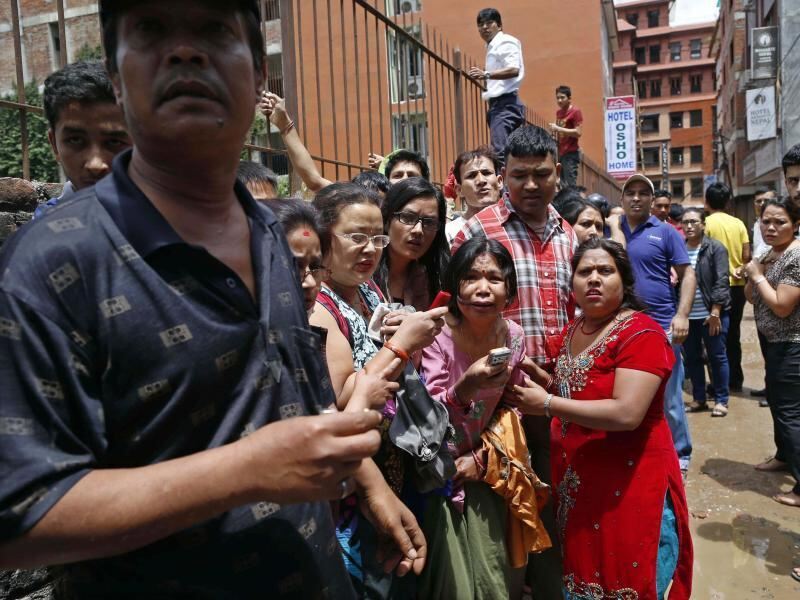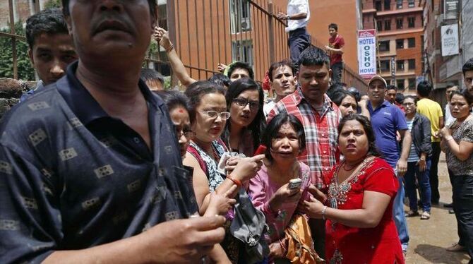 Halten die Gebäude? Die Bewohner von Kathmandu haben sich auf die Straßen gerettet und beobachten, ob Häuser einzustürzen drohen. Foto: Mast Irham