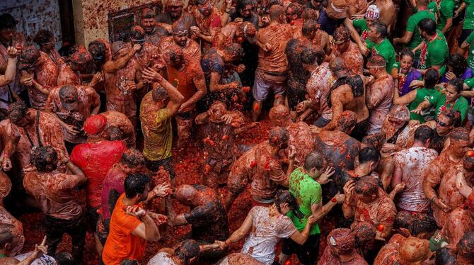 Rund 22.000 Menschen haben sich in Spanien eine verrückte Tomatenschlacht geliefert. Eine Stunde lang bewarfen sich die Teilnehmer in Buñol in der Region Valencia gegenseitig mit den überreifen und matschigen Früchten. Als Munition wurden insgesamt gut 120 Tonnen Tomaten benutzt, die nach Beteuerung der Organisatoren nicht mehr zum Verzehr geeignet waren. Laut dem Guinness-Buch der Rekorde handelt es sich um die größte Lebensmittelschlacht der Welt.