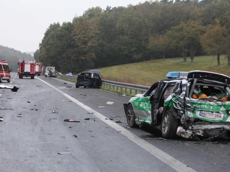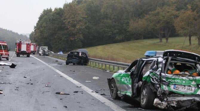 Zerstörter Polizeiwagen am Unfallort auf der A3. Foto: Sven Grundmann