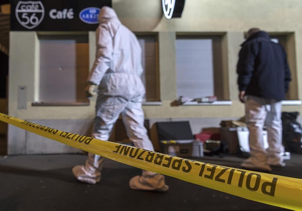 Polizeiabsperrung vor dem Cafe 56 an der Erlenstrasse in Basel, Schweiz. Dort kam es zu einer Schiesserei, bei der zwei Männer getötet und einer schwer verletzt wurden. Foto: Georgios Kefalas/KEYSTONE/dpa