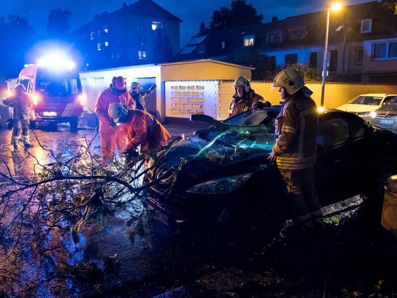 Feuerwehrmänner schneiden nach einem schweren Unwetter in Hannover ein Fahrzeug unter einem Baum frei. Foto: Peter Steffen