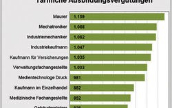 Bei der Bezahlung gibt es je nach Ausbildungsberuf deutliche Unterschiede. Am meisten verdienten, wie im Vorjahr, Azubis im Beruf Zimmerer/Zimmerin mit monatlich 1254 Euro. Auch angehende Maurer, Rohrleitungsbauer und Kaufleute in der Banken- und Versicherungsbranche bekommen überdurchschnittlich hohe Azubi-Vergütungen. Vergleichsweise schlecht bezahlt werden dagegen Azubis, die Maler, Bäcker, Schornsteinfeger oder Friseur werden wollen. Hier liegen die Vergütungen bei 850 Euro und darunter. Am wenigsten gab es mit 652 Euro im Beruf Orthopädieschuhmacher.