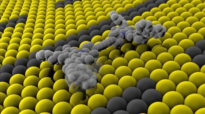 Das Foto zeigt ein winziges Nano-Auto auf einer Kupferscheibe in Bewegung. Das kleinste Auto der Welt besteht aus einem einzigen Molekül. Das winzige Fahrzeug ist nur rund einen milliardstel Meter (Nanometer) lang und wird elektrisch angetrieben. Foto: Randy Wind und Martin Roelfs/Universität Groningen/dpa
