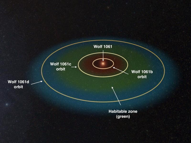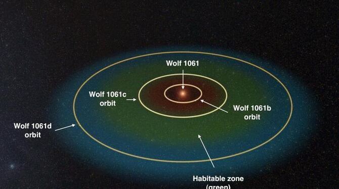 Die Illustration zeigt das Nachbarstern-System Wolf 1061, das 14 Lichtjahre entfernt ist, mit drei Planetenlaufbahnen. Der grüne Bereich zeigt die Zone an, in der Leben möglich wäre. Foto: UNSW Australia