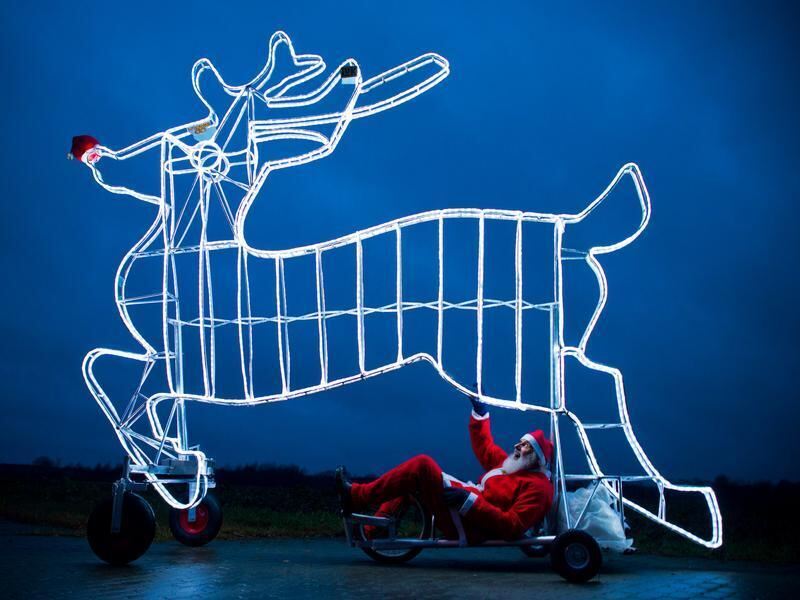 Fahrrad-Designer Dieter Senft präsentiert ein fahrbares und beleuchtetes Rentier. Niederländische und norwegische Wissenschaftler haben das Rätsel um die rote Nase des berühmtesten Rentiers »Rudolph« gelöst. Foto: Patrick Pleul/Archiv