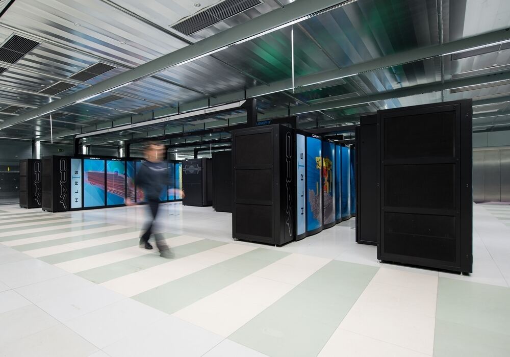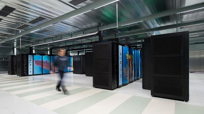 Mensch und Maschine: Ein Mitarbeiter des Hochleistungsrechenzentrums Stuttgart (HLRS) der Universität Stuttgart geht an den Rechnerschränken des Großrechners »Hazel Hen« vorbei.