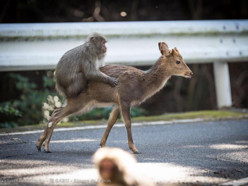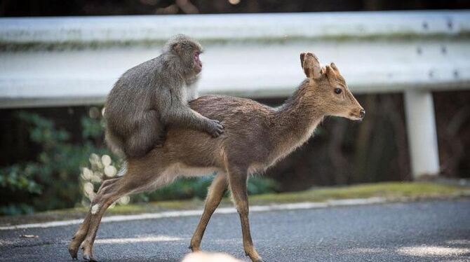 Ein Makaken-Männchen sitzt auf dem Rücken einer Sikahirsch-Kuh. Foto: Alexandre Bonnefoy