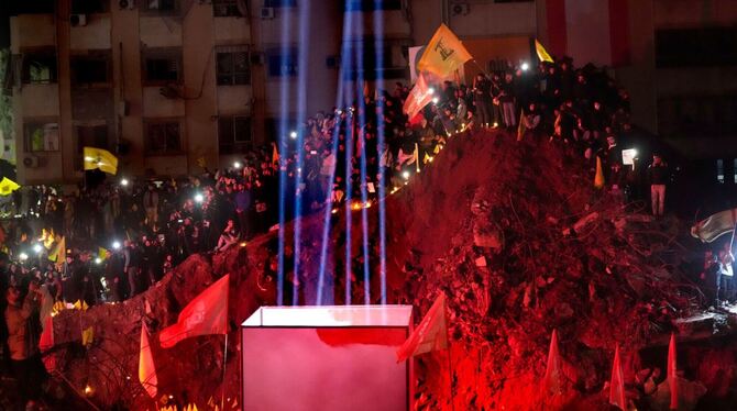 Südlich von Beirut versammelten sich am Abend zahlreiche Menschen an dem Ort, an dem der ehemalige Hisbollah-Anführer Hassan Nasrallah Ende September durch einen israelischen Luftangriff auf das Hauptquartier der Schiitenmiliz getötet worden war. Auf Bildern war zu sehen, wie Menschen sich inmitten einer Art Brachfläche umgeben von höheren Häusern zusammenfanden. Kerzen und die gelben Flaggen der Hisbollah steckten in den Trümmern. Aus der Mitte der Menschenmasse wurden gleißende Lichtstrahlen gen Himmel gerichtet. Die Veranstaltung am »heiligen Ort des Martyriums« stand unter dem Motto »Licht aus Licht«. Der frühere Standort des Hauptquartiers der Hisbollah im Viertel Haret Hreik dürfte damit bereits zu einer Art Pilgerstätte für Anhänger der Hisbollah geworden sein.